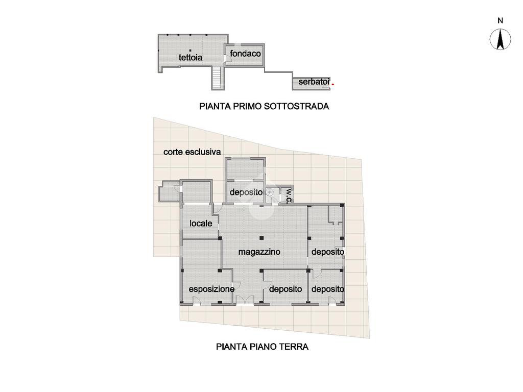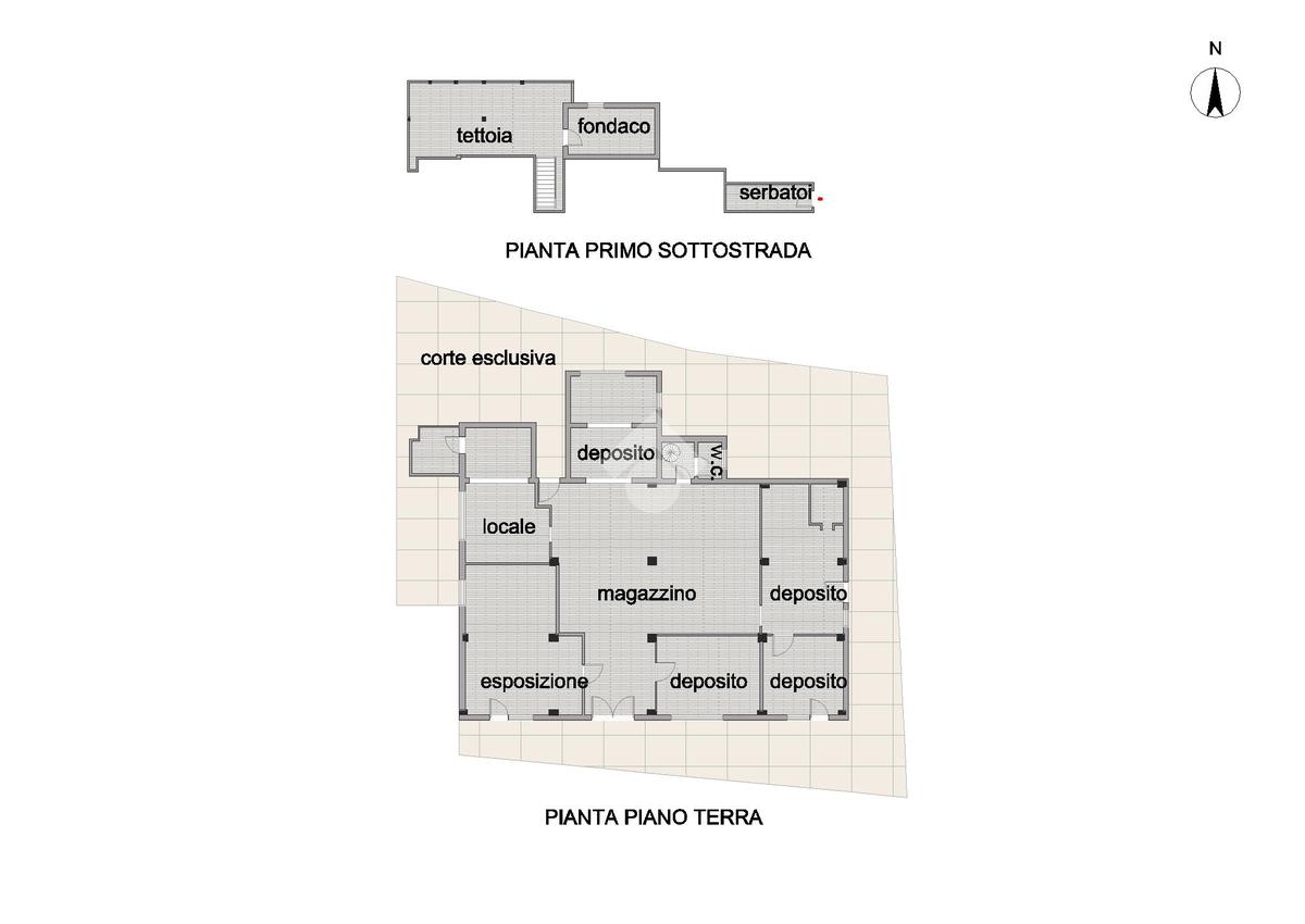 Al piano sottostrada sono presenti ulteriori spazi accessori, tra cui un fondaco, locali tecnici con serbatoi e una tettoia, utili come ambienti di supporto all’attività principale.