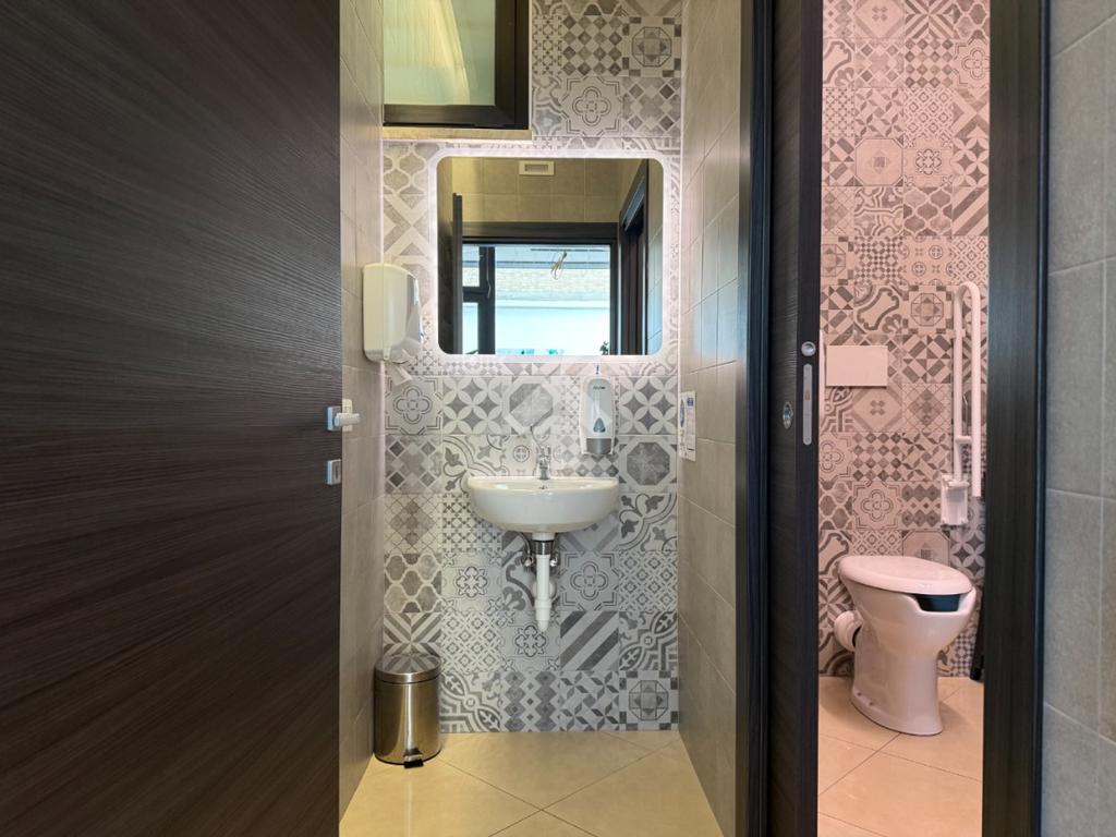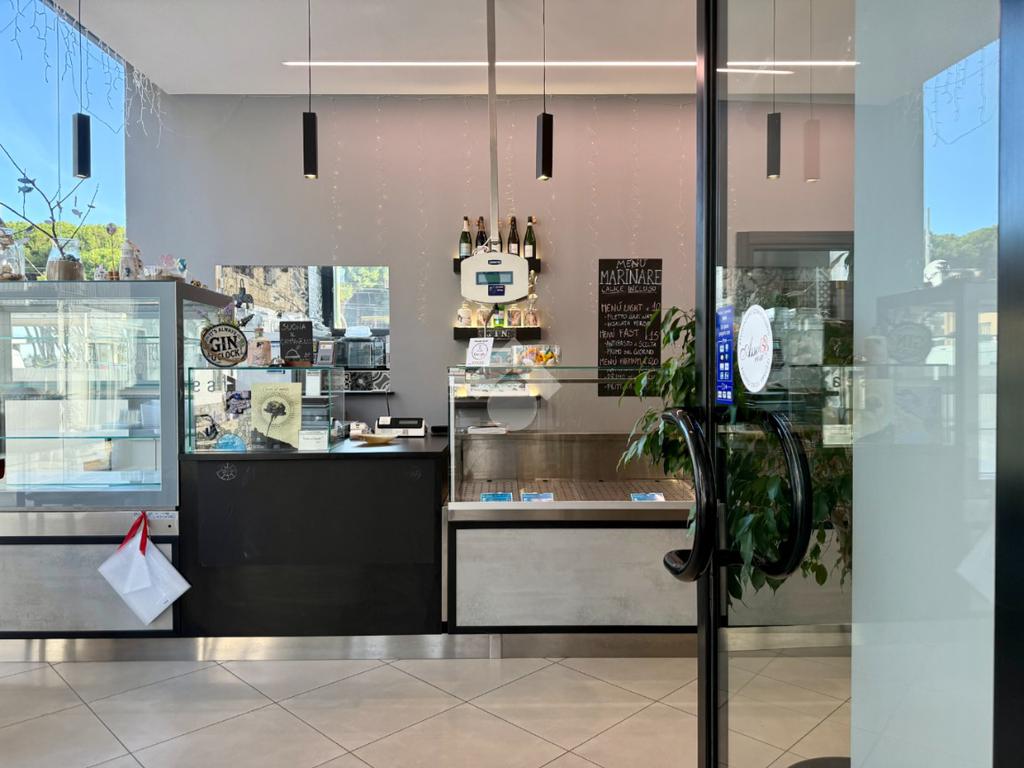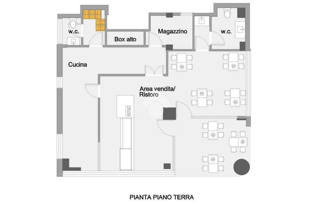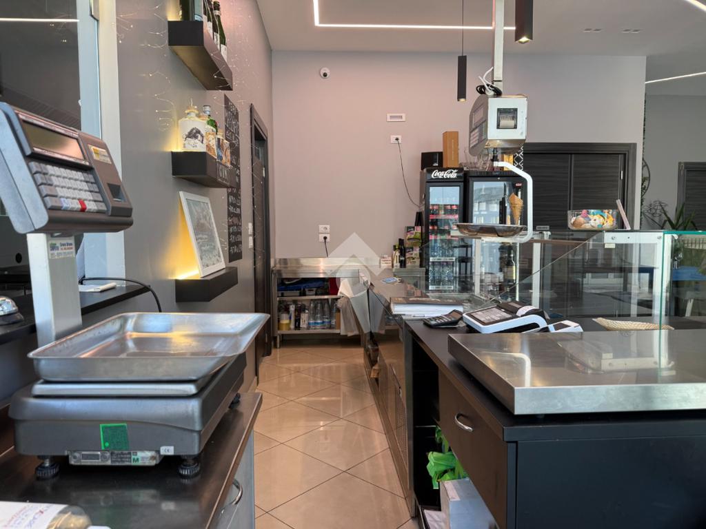 La zona dedicata al servizio e alla vendita include una vetrina espositiva per asporto, un piano caldo, un banco refrigerato da 180 cm per prodotti freschi e una postazione di lavoro comoda e ben organizzata. I servizi sono completi e a norma: bagno e antibagno per il personale con armadietti e bagno clienti a norma per disabili, con antibagno dedicato.